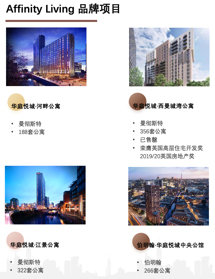 Select於2016年推出Affinity Living華庭悅城品牌,以年輕富裕的城市租住人群作為主要客戶群體,旗下公寓有先進配套設施、服務、寵物友善、優越地理位置,短短數年一躍成為享譽英國的住宅品牌。目前在曼徹斯特已有4個在市場上大獲成功的面世項目,口碑與品質並存。