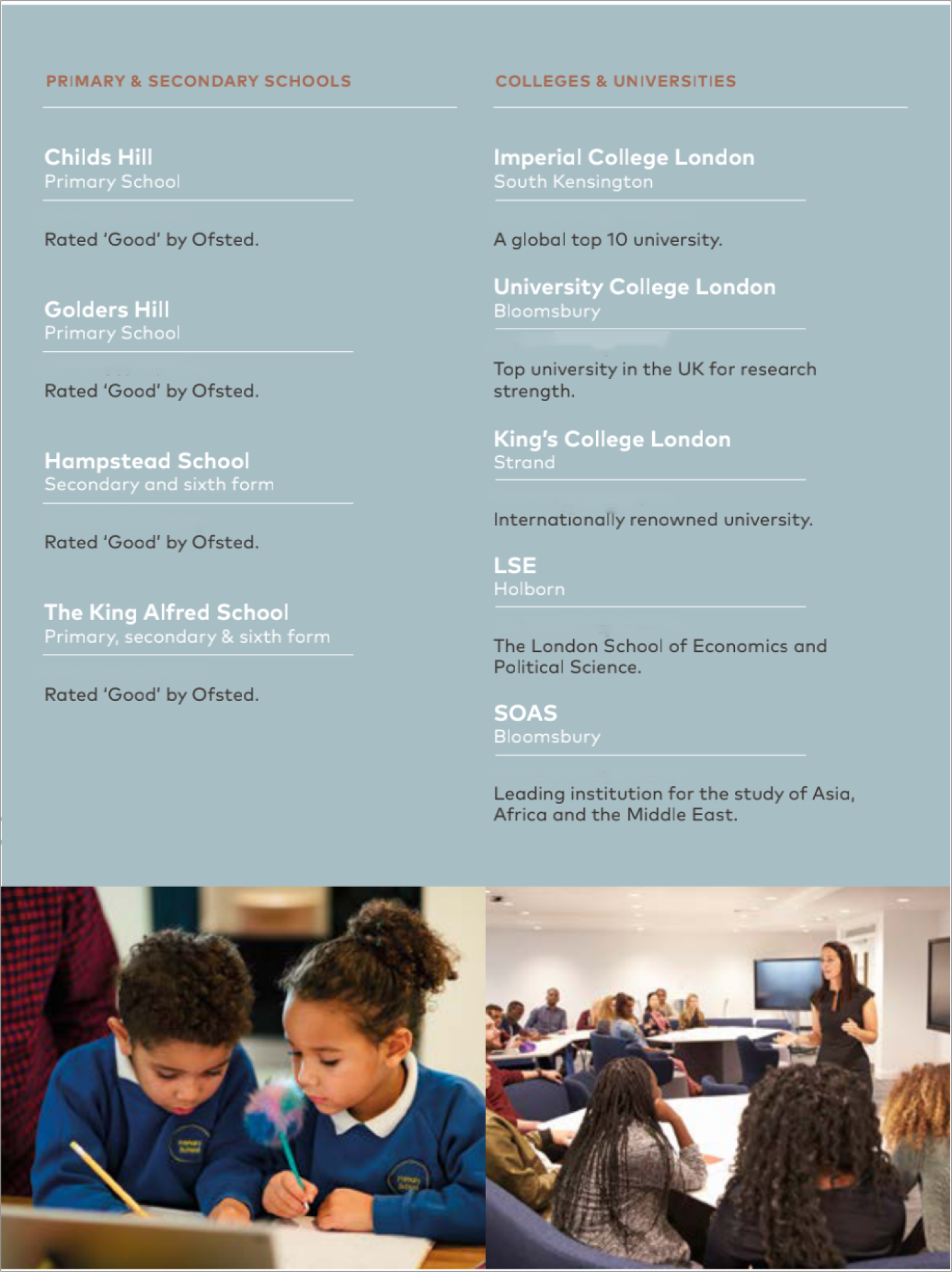 步程可達的Childs Hill Primary School、Golders Hill Primary School、Hampstead School Secondary等學校獲Ofsted推薦。