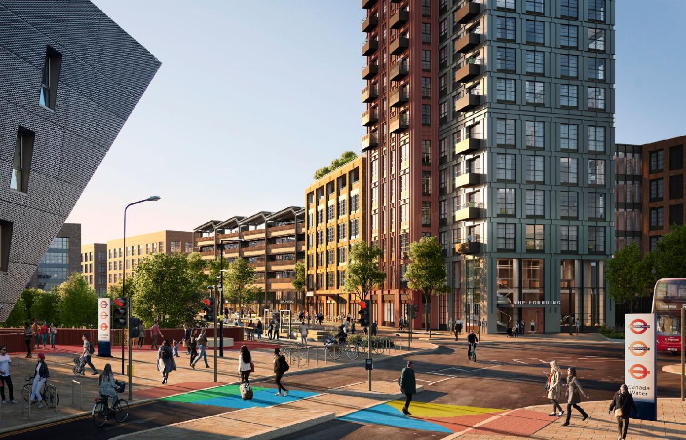 4.專案步行即可到達Canada Water車站,該站設有地鐵Jubilee Line及地上鐵路Overground。從這裡出發,地鐵一站即可直達金絲雀碼頭。