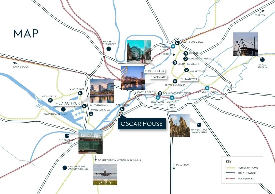 從專案所在地出發,步行可到達各式各樣的酒吧、商店和娛樂場所,如:Spinningfields 購物中心、Deansgate 火車站、牛津路車站(OxfordRoad Station)和老特拉福德球場(OldTrafford)等。週邊商業/媒體中心