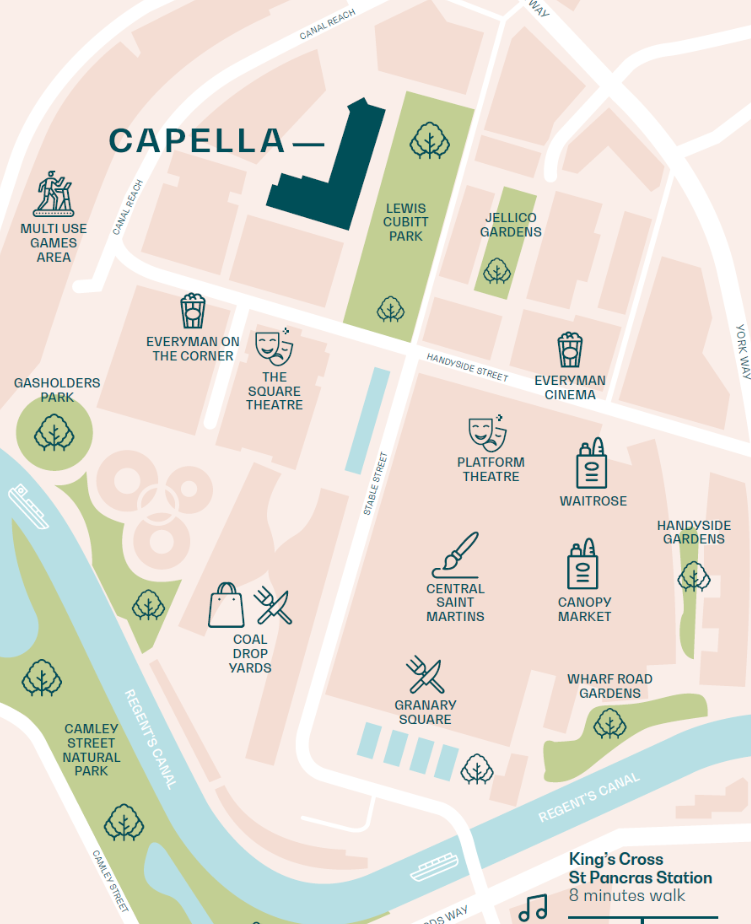 專案位於國王十字地塊中心的路易斯丘比特公園(Lewis Cubitt Park)西側,位置優越。優美的文化景觀、繁榮的商業社區、無數的交通線都聚集在國王十字車站。