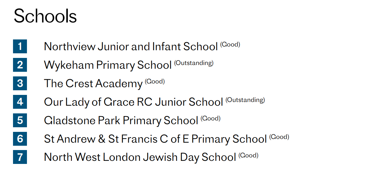 專案週邊被Ofsted評級「優秀(Outstanding)」的Wykeham Primary School和Our Lady of Grace RC Junior School均在計畫約短時間內車程範圍內。計畫所在地區還有五個Ofsted評級「良好(Good)」的中小學。