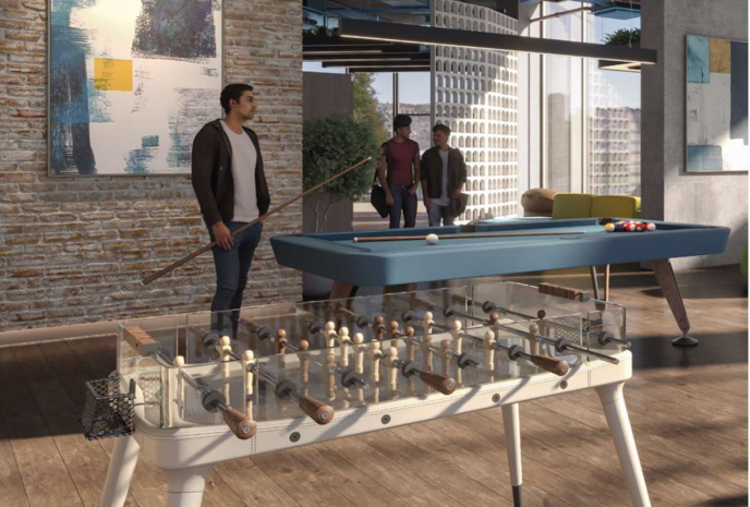 公寓室內裝潢以現代風格為特色,採用落地窗設計,因此空間顯得格外寬敞明亮。另外,整合式的廚房和浴室設施讓整體佈置更加簡潔大方,與開放式廚房相連的客廳也讓住戶有了更多的活動空間。在公寓的公共設施方面,貼心地為住戶提供了工作、娛樂的場所,以及保障安全的措施,包括: