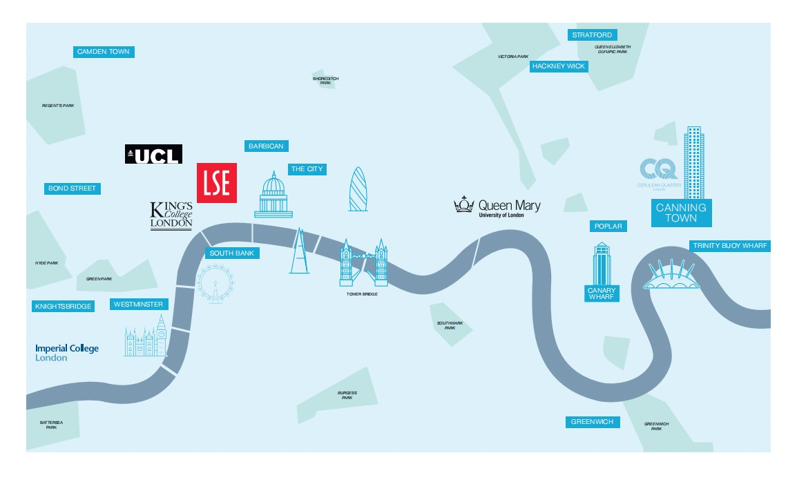 加上原本就在東倫敦的格林威治大學、倫敦瑪麗女王大學、貝葉斯商學院(原卡斯商學院)等,以及倫敦的眾多其他名校,KCL、LSE 、聖馬丁等都能輕鬆前往。