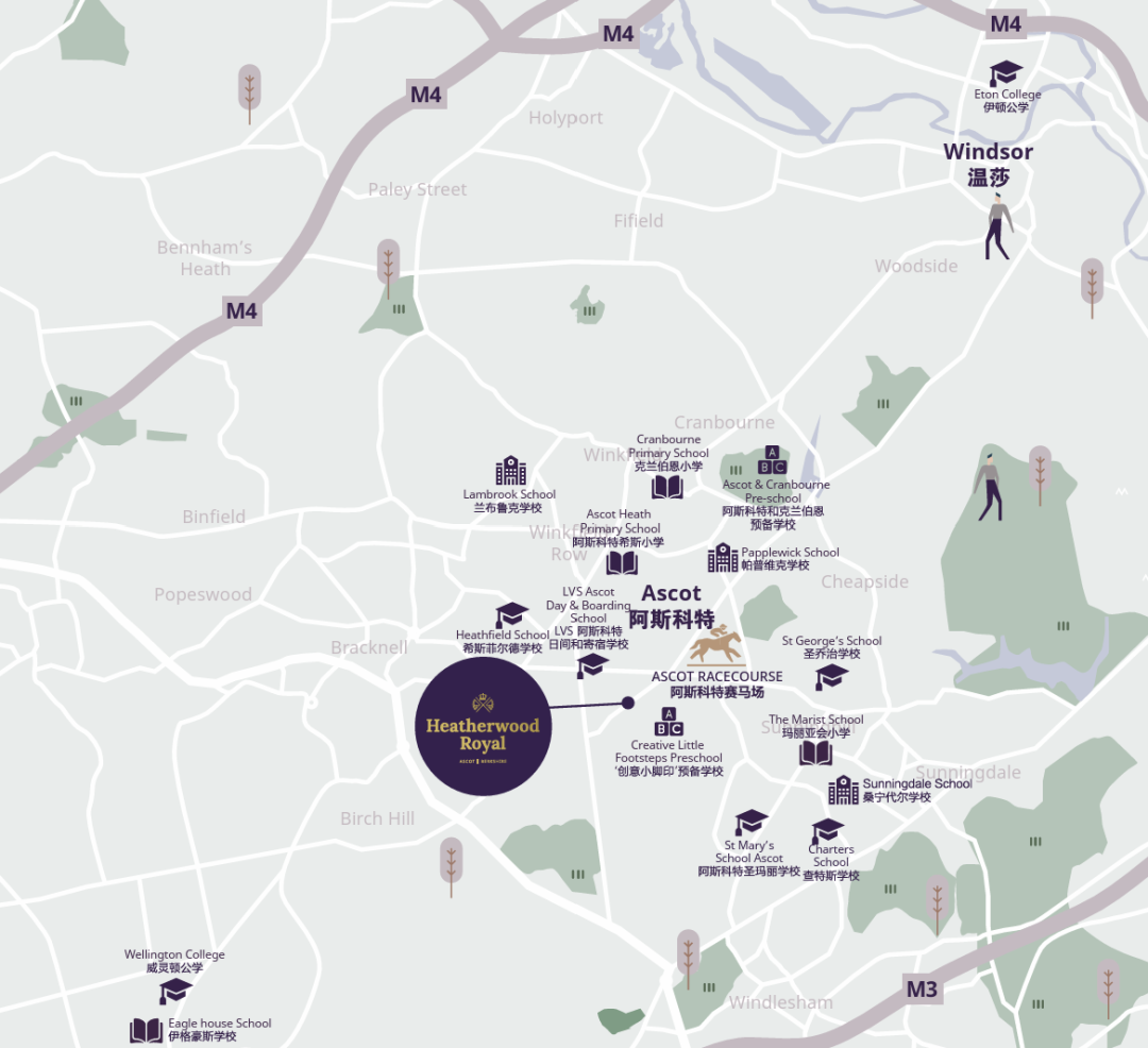 Heatherwood Royal週邊環繞的教育機構,包括知名的伊頓公學(Eton College)、惠靈頓公學(Wellington College),以及許多享有盛譽的小學和預備學校。這些優質學府的存在使Heatherwood Royal成為注重子女教育和未來發展的家庭之選。