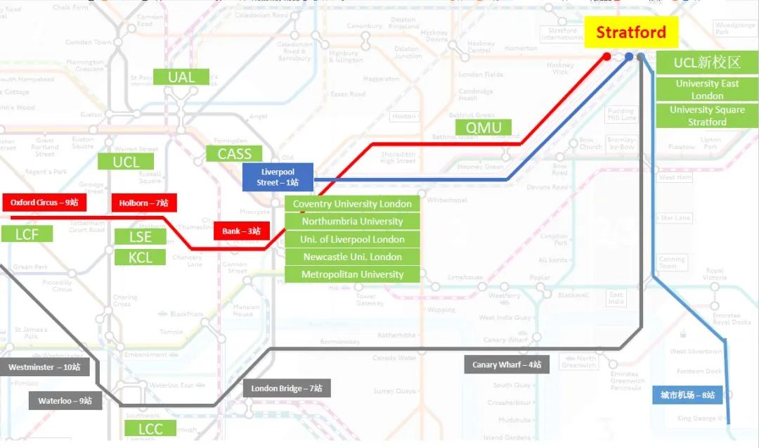 從Stratford地鐵站出發,可輕鬆抵達倫敦各大名校LSE、KCL、CASS、UCL、UAL、LCF等,因此倫敦各大學校的學生都非常喜愛居住在生活和交通都極為便利的Stratford區域。