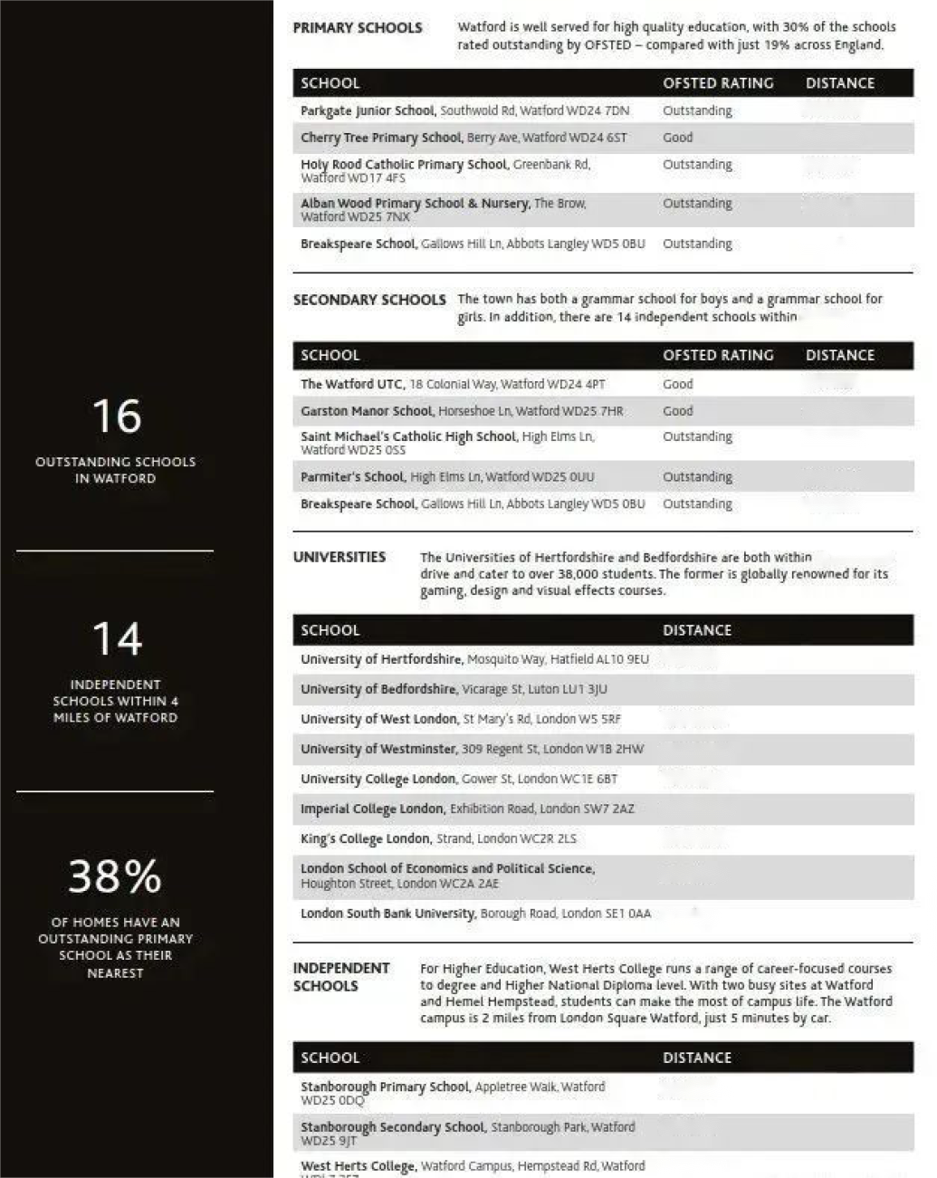 大名鼎鼎的哈羅公學從這裡開車很快就能到達。步行範圍內就可到達知名的 Watford Grammar School 文法學校女校,短暫的騎行範圍內则可到 Watford Grammar School 文法學校男校。這兩所學校是許多家長心中的夢想學校!