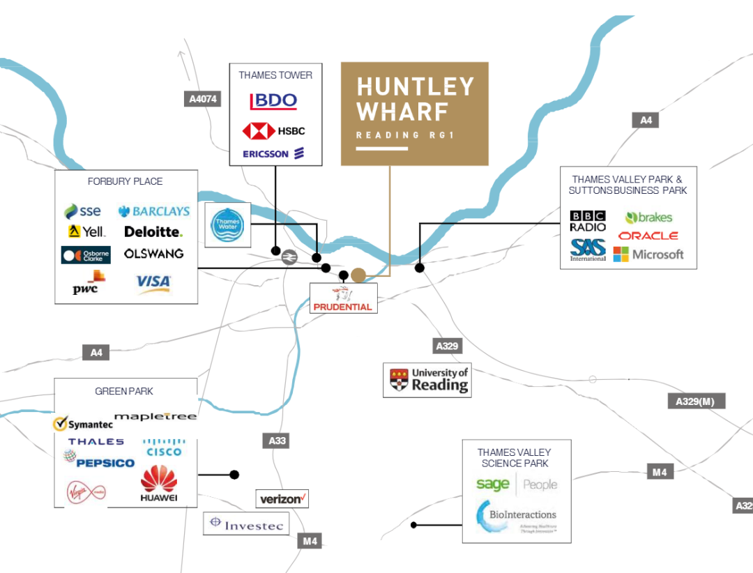 Huntley Wharf計畫位於雷丁市區,郵編RG1。週邊有華為、甲骨文、思科等多家科技公司,商業優勢極大。步行可至雷丁火車站。