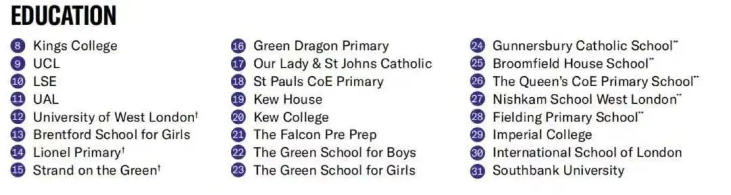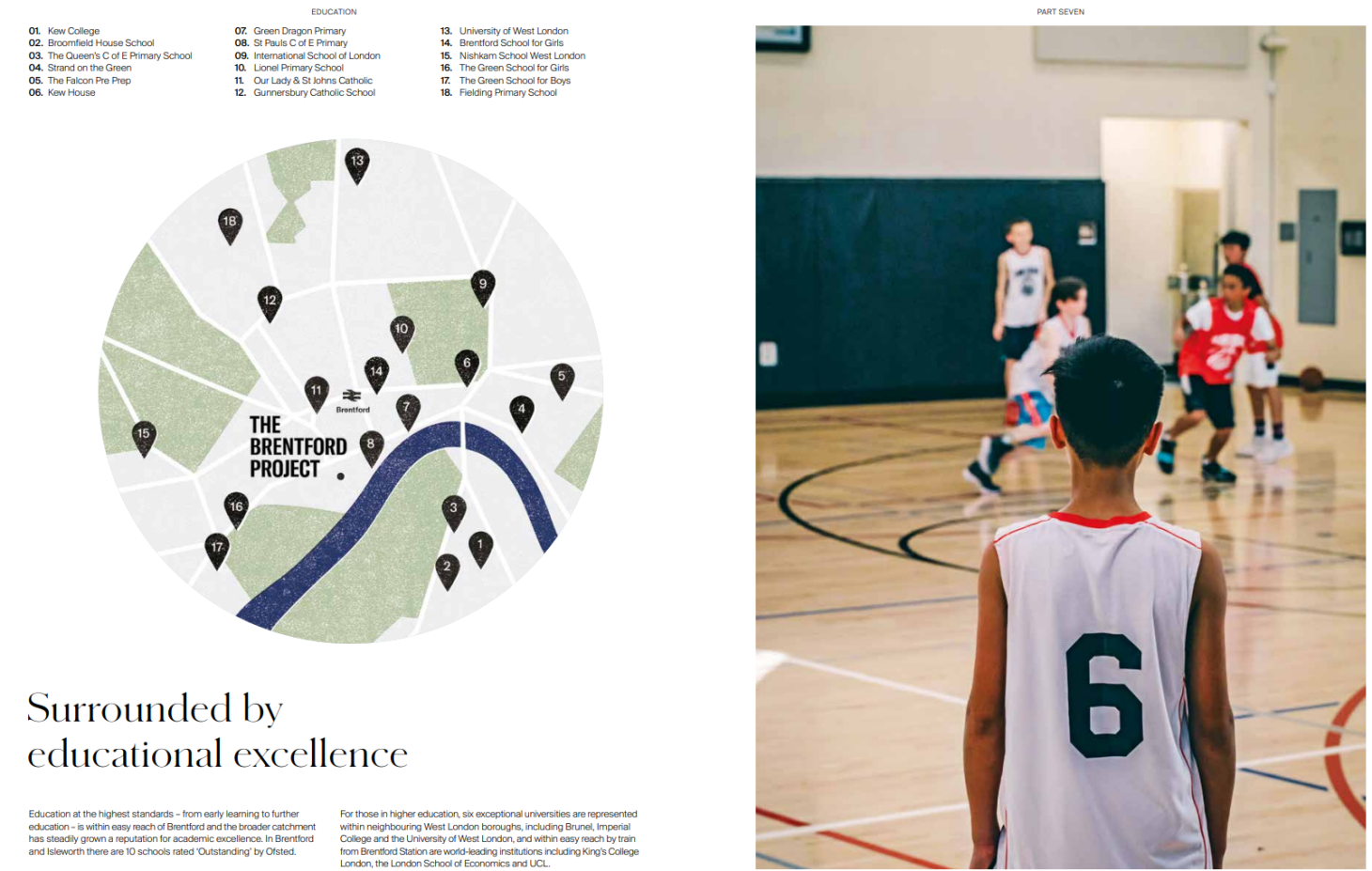 布倫特福德擁有豐富的教育資源,在計畫範圍內即涵蓋了11家教育標準局(Ofsted) 認可的中小學。西倫敦大學、帝國學院、倫敦藝術大學等諸多大學分佈在附近及週邊,教育資源非常豐富,使得布倫特福德計畫分外耀眼。