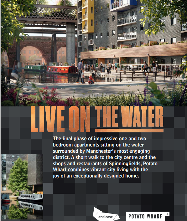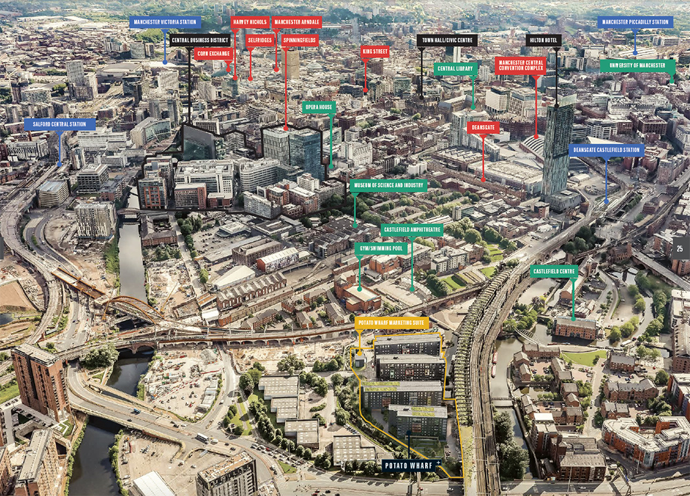 Potato Wharf計畫位於曼徹斯特街區卡索菲爾德(Castlefield)區域,依卡索菲爾德(Castlefield)河畔而居。在這裡歷史與現代融合,享受寧靜與安詳,被譽為「水景街區」。步行可到達曼徹斯特商務區(相當於上海陸家嘴)、地鐵(電車)交通樞紐站(即轉乘站)還有主要的商業零售區。