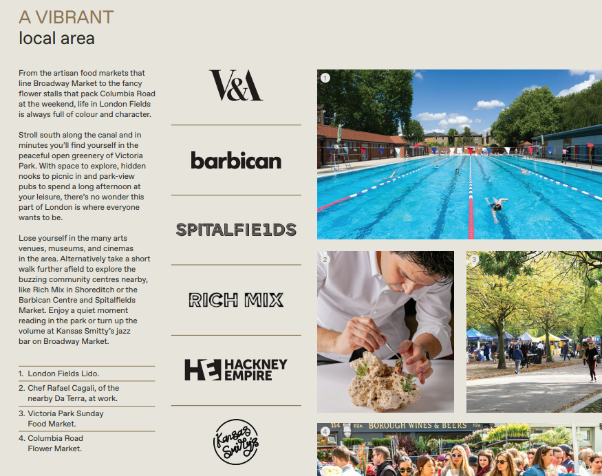 2.商業配套優異:建案周邊市集眾多,兩站地鐵即達倫敦購物區——西田斯特拉特福德城購物區(Westfield Stratford City),無論是逛街或是購物均異常方便。附近擁有三家米其林星級餐廳,倫敦著名劇院哈克尼帝國(Hackney Empire),巴比肯中心(Barbican Centre)距離建案甚近,娛樂場所豐富,藝術氣息濃厚。